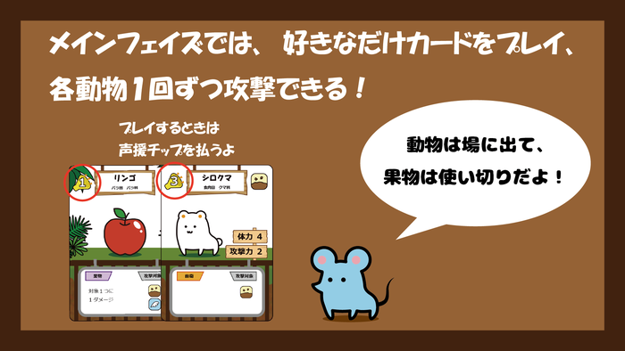動物と果物を駆使して、相手の動物園に先に10ダメージ与えたプレイヤーが勝者となります。