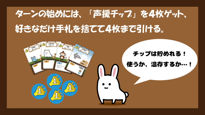 このゲームでは、各ターンにもらえる声援チップを使用して、動物や果物カードをプレイし、相手の動物や動物園を攻撃します。