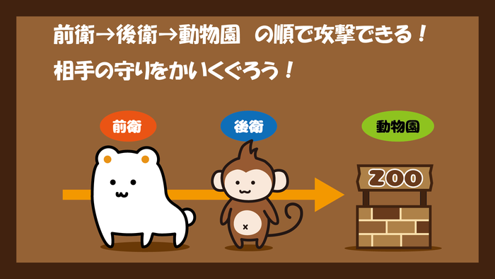 最強の攻撃力を誇るライオン、前に動物がいても動物園を攻撃できるモグラ、地上の動物を一掃するメロンなど、多彩なカードを駆使して勝利をつかみましょう!